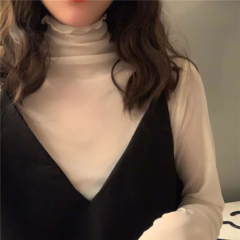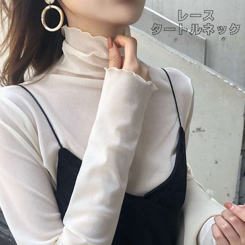 春夏レディーストップス長袖レースタートルネック4色美ライン